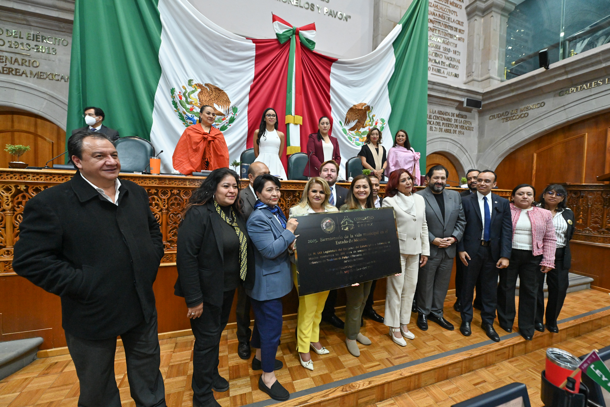 La placa expone la leyenda: La H. LXII Legislatura del Congreso del Estado Libre y Soberano de México conmemora los 200 años de creación del municipio libre y soberano de “Tecámac de Felipe Villanueva”, polo de desarrollo y bienestar del Valle de México. “2025. Bicentenario de la vida municipal en el Estado de México” a los 12 días del mes de septiembre del 2025.