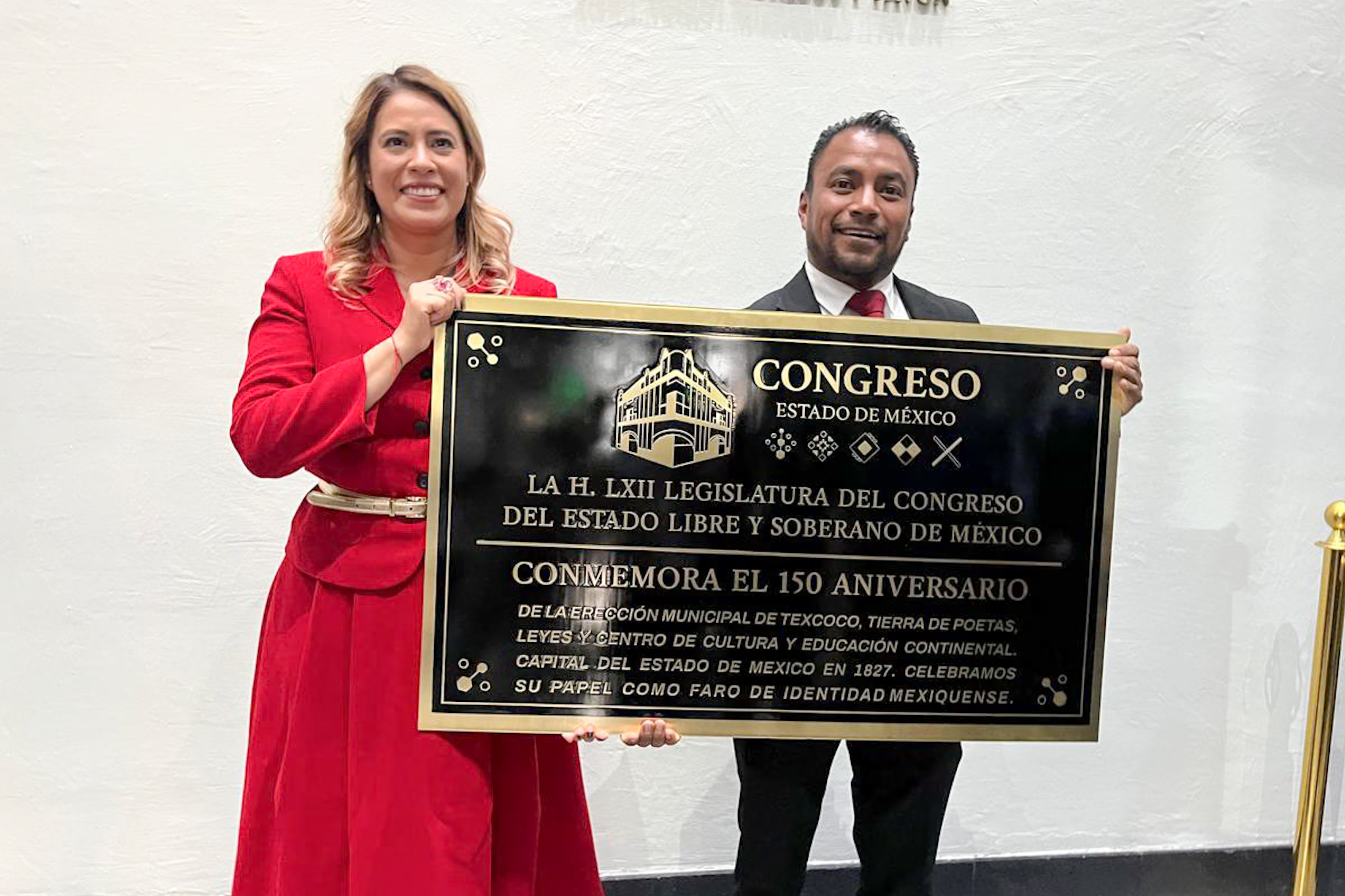 A iniciativa de la legisladora María José Pérez Domínguez y el diputado Samuel Hernández Cruz, ambos de morena, en la LXII Legislatura mexiquense se develaron placas conmemorativas por los 150 años de la creación del municipio de Texcoco y por los 200 años de la fundación de Tecámac.