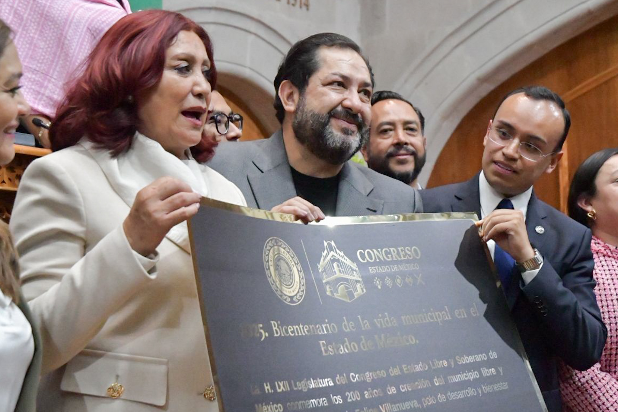 La placa expone la leyenda: La H. LXII Legislatura del Congreso del Estado Libre y Soberano de México conmemora los 200 años de creación del municipio libre y soberano de “Tecámac de Felipe Villanueva”, polo de desarrollo y bienestar del Valle de México. “2025. Bicentenario de la vida municipal en el Estado de México” a los 12 días del mes de septiembre del 2025.