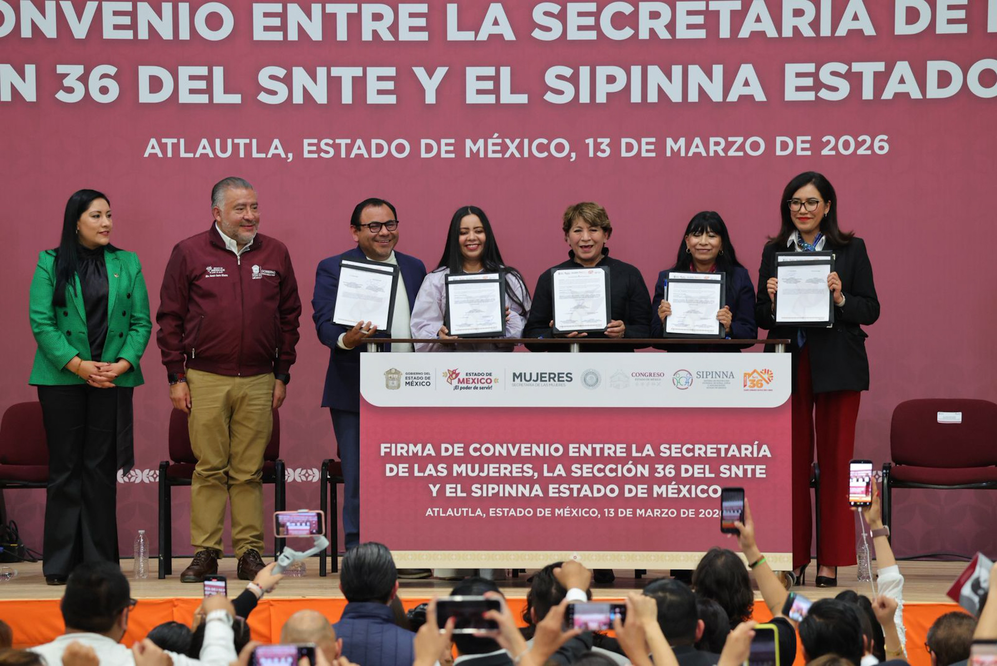 El convenio citado, que busca poner en el centro de las políticas públicas a niñas, niños y adolescentes, así como protegerlos en el ámbito educativo transformando las aulas en espacios seguros y libres de violencia con perspectiva de género, fue firmado por Delfina Gómez, como testigo de honor, el diputado Rigoberto Vargas, como presidente de la Comisión legislativa de Educación, Cultura, Ciencia, Tecnología e Innovación, así como por las personas titulares de la Secretaria de las Mujeres, el Sipinna, y la Sección 36 del SNTE.